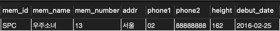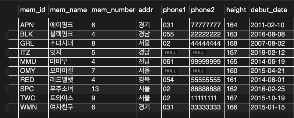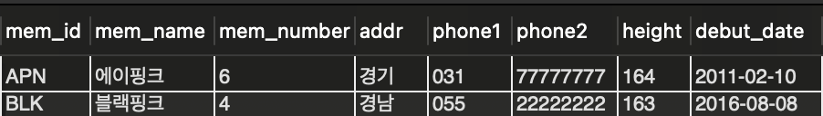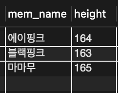 where mem_name = '블랙핑크'; -- 멤버 이름은 문자형이므로 ''로 묶어서 확인