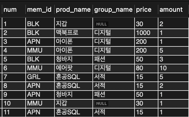 구매 테이블의 경우, 자동으로 순번이 들어가기 때문에 '컬럼1에 맞는 데이터값'은 항상 NULL 입력됨