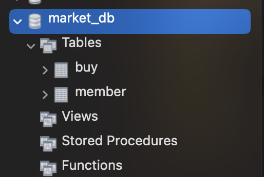 SCHEMAS에서 market_db와 buy, member 테이블이 생성되었는지 확인